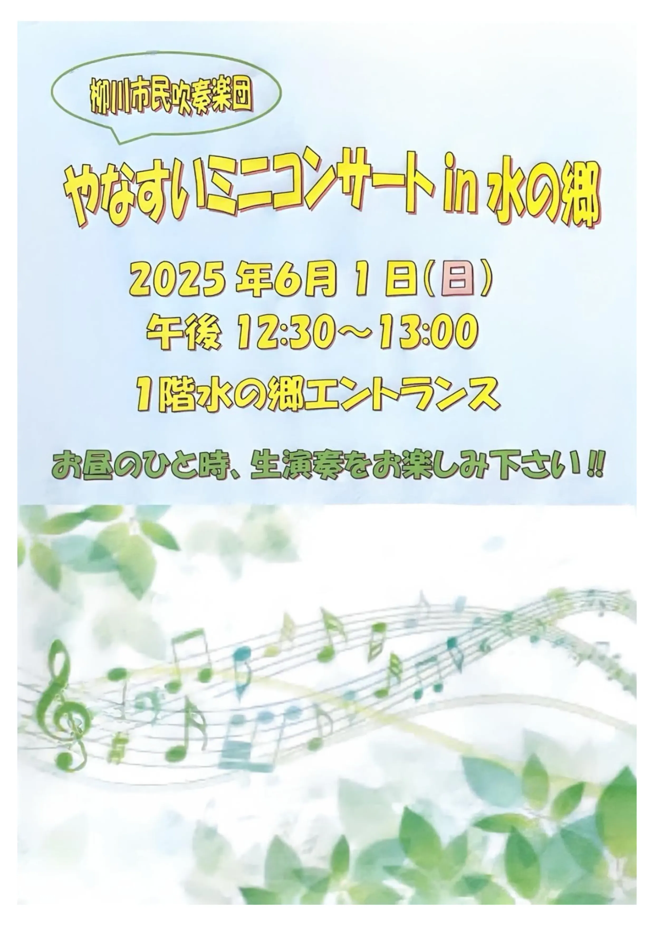 6月1日(日)、柳川総合保健福祉センター「水の郷」のエントランスホールで「やなすいミニコンサートin水の郷」を開催しました。
