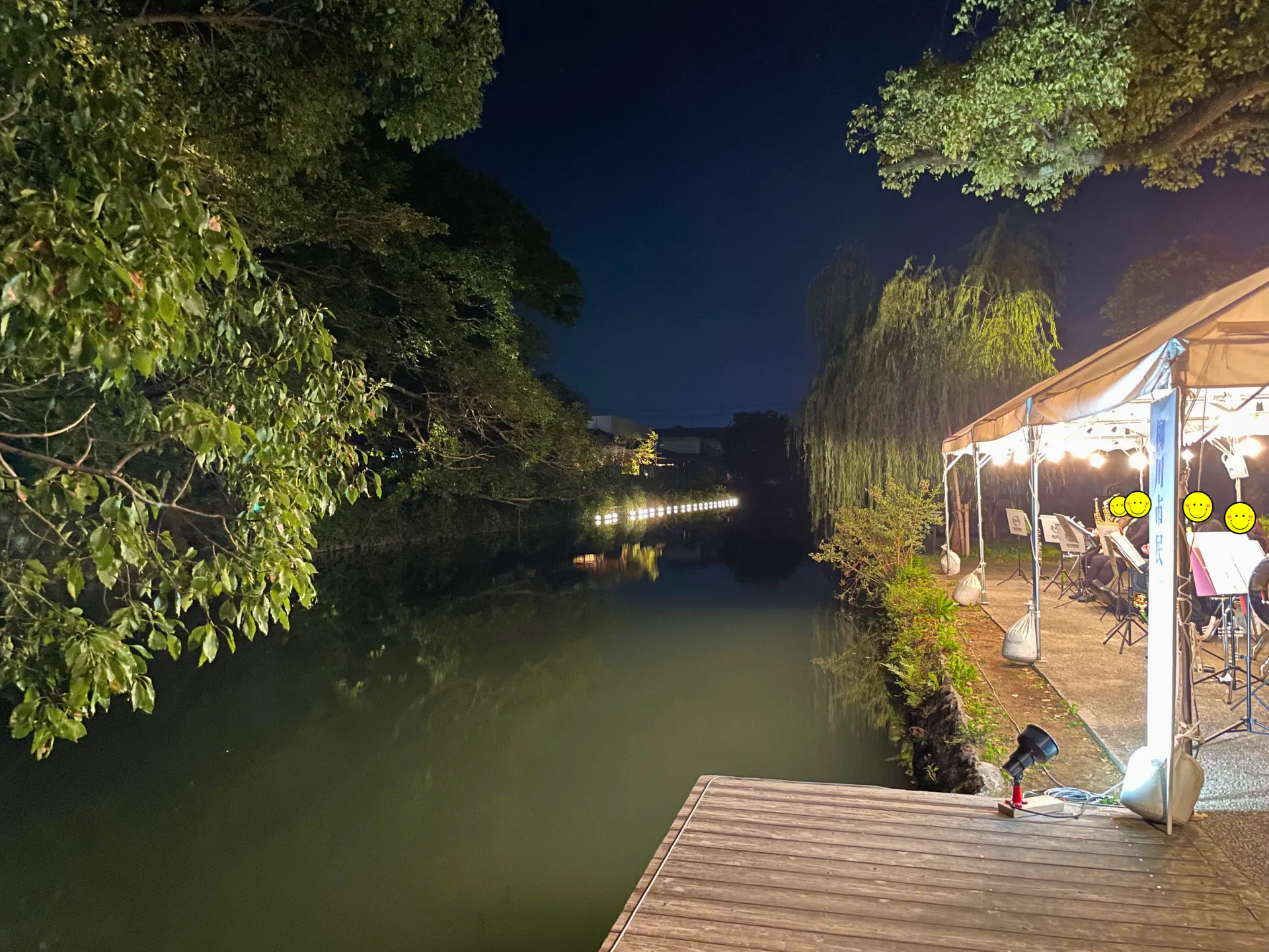その幻想的な風景を、袋町遊歩道から「水上おもてなし演奏」でお迎えしました。